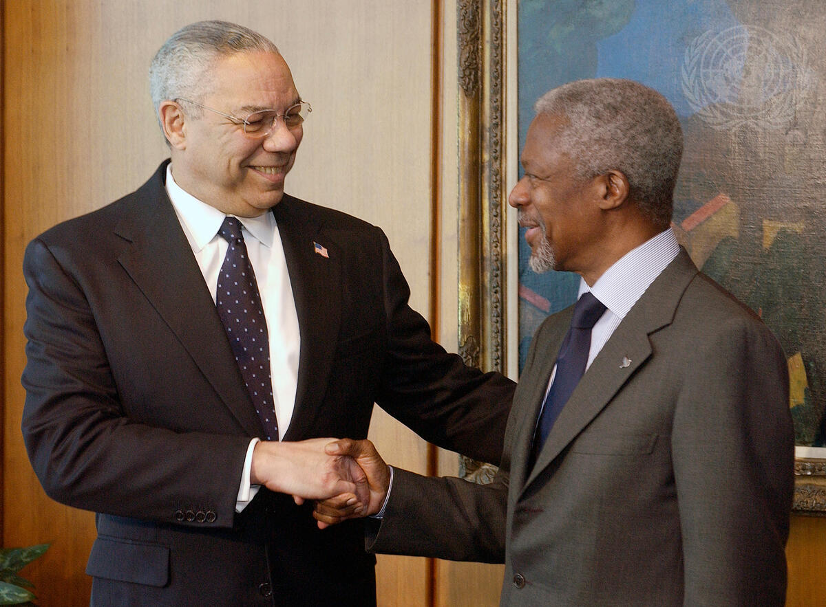 Secretary-General Kofi Annan (right) shaking hands with Colin L. Powell, Secretary of State of the United States.