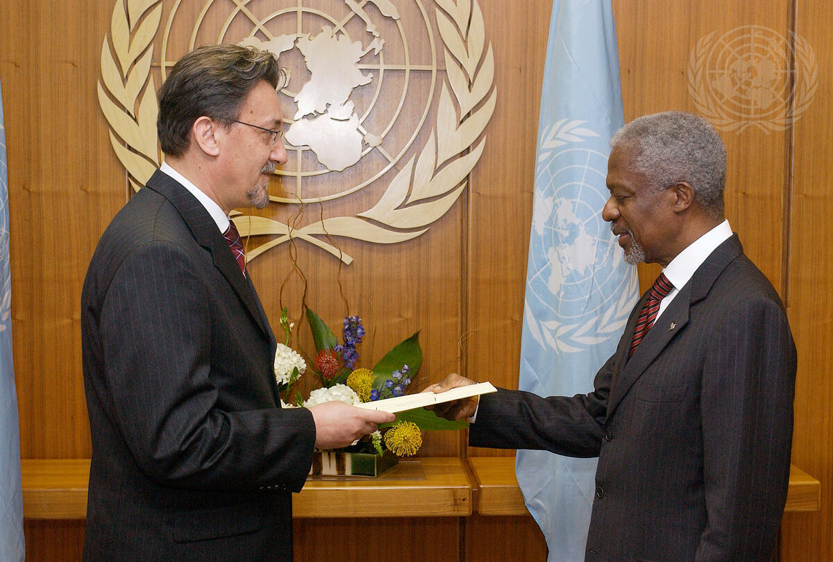 Nebojsa Kaludjerovic (left), new Permanent Representative of Serbia and Montenegro to the United Nations, presents his credentials to Secretary-General Kofi Annan.
