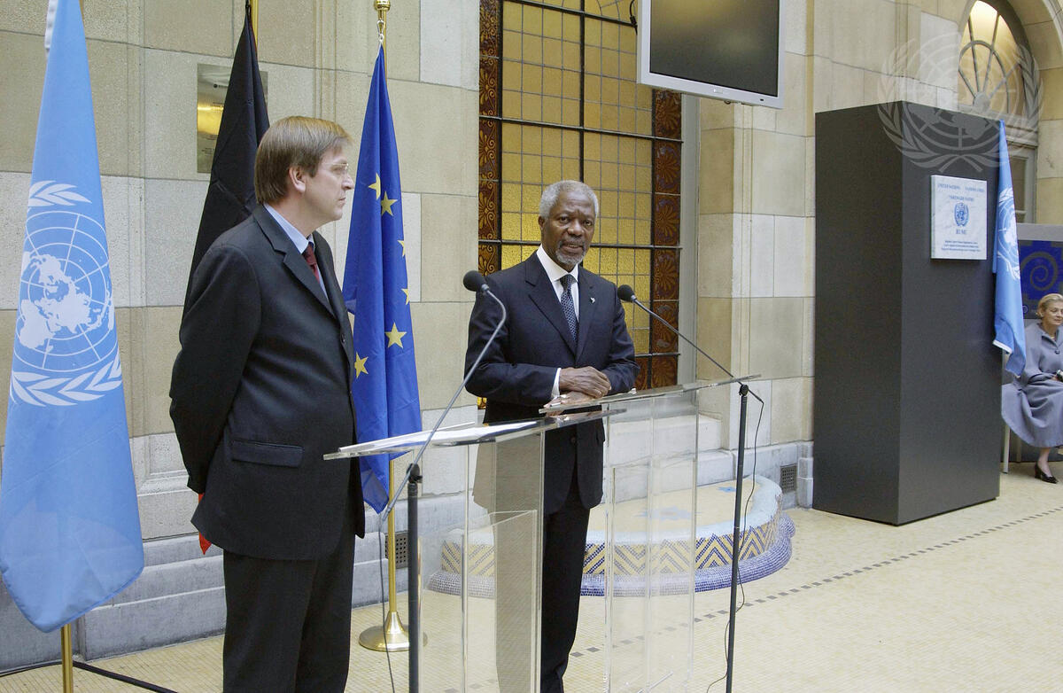 Secretary-General Kofi Annan (right) addressing at the inauguration ceremony of the European Regional United Nations Information Centre in Brussels, which replaces nine national UN information centers that were closed down at the end of 2003. At left is Guy Verhofstadt, Prime Minister of Belgium. The Secretary-General traveled to Brussels, Belgium, on the fifth leg of his 12-day trip to Europe.