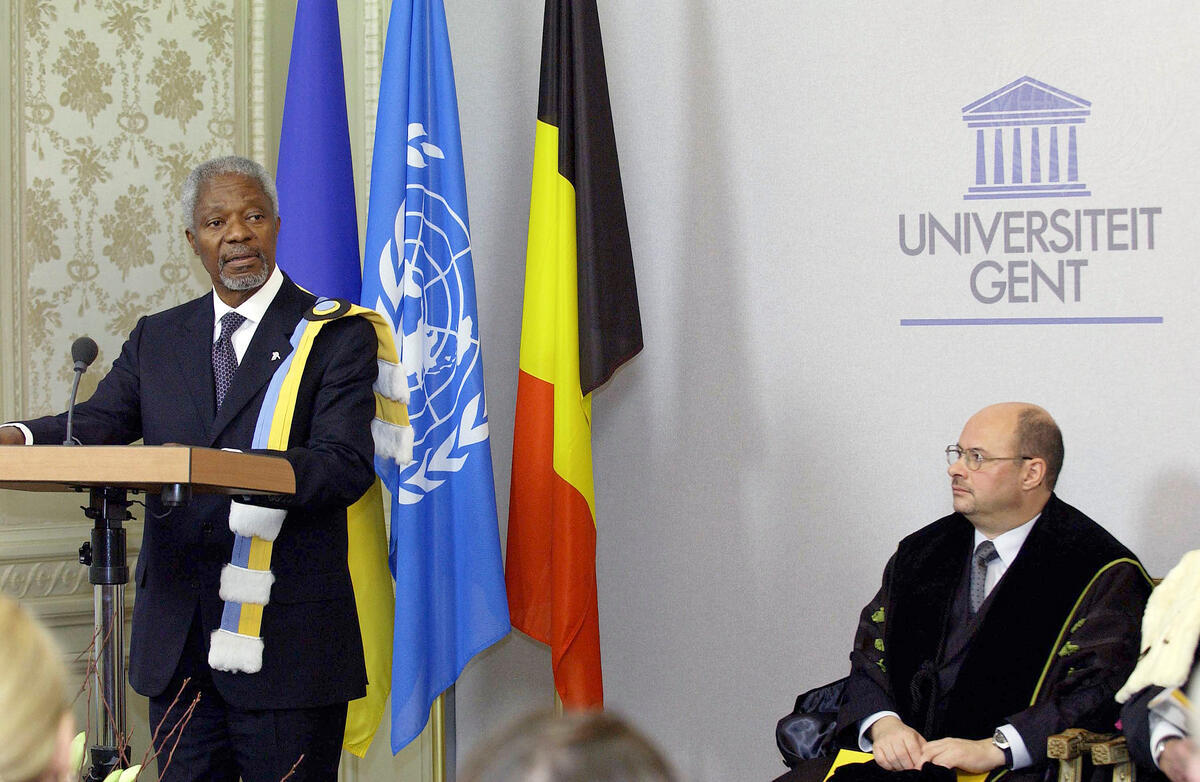 Secretary-General Kofi Annan (left) addressing at the ceremony of the honorary doctorate degree ""honoris causa"" bestowed on the Secretary-General by the University of Gent. The Secretary-General traveled to Brussels, Belgium, on the fifth leg of his 12-day trip to Europe.