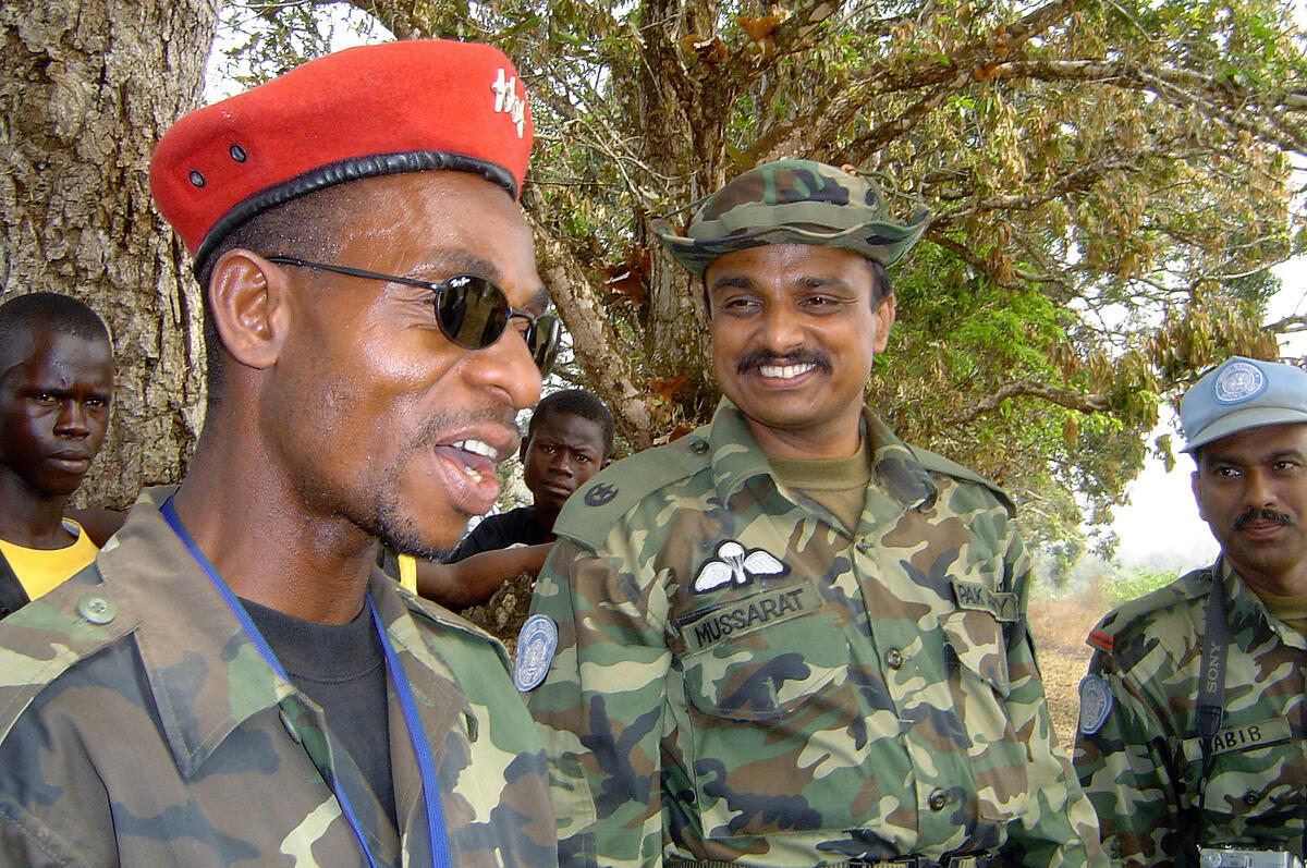 General Prince Seo (left), Liberians United for Reconciliation and Democracy, with Capt. Mussarat (centre) Pakistani peacekeeper, in Bopolu, Gbarpolu County, where United Nations Mission in Liberia (UNMIL)'s disarmament, demobilization, rehabilitation and reintegration (DDRR) programme team visited to inform ex-combatants about its program.