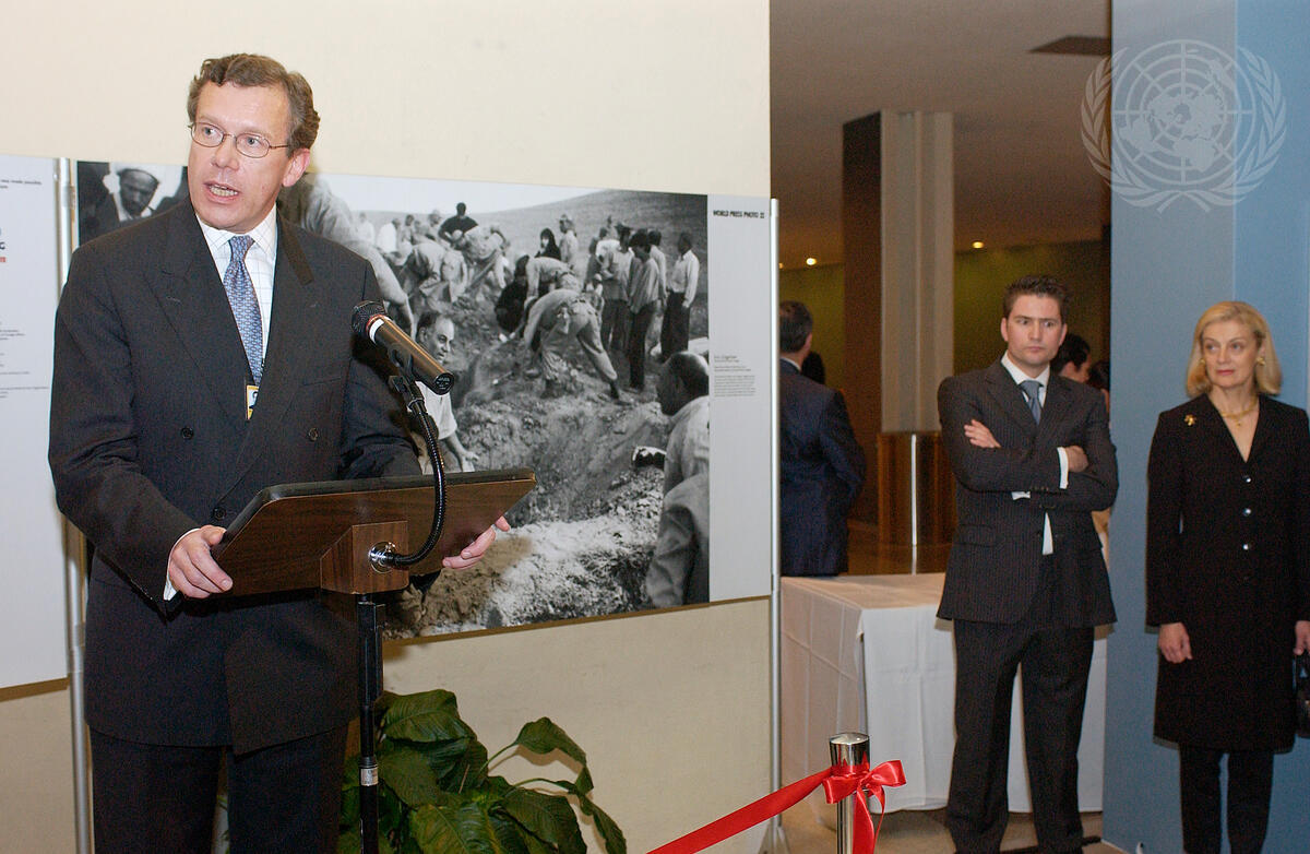Dirk Jan van den Berg (left), Permanent Representative of the Kingdom of the Netherlands to the UN, speaks at the opening event. Also shown is Mrs. Nane Annan (far right) and Michiel Munneke (second from right), Managing Director of the World Press Photo Foundation.