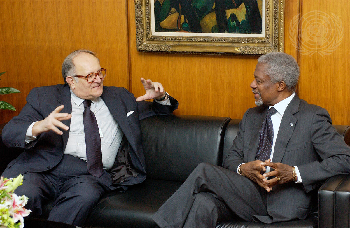 Secretary-General Kofi Annan (right) meets with Cornelio Sommaruga, President of Initiatives of Change International as well as the Geneva International Centre for Humanitarian De-Mining.