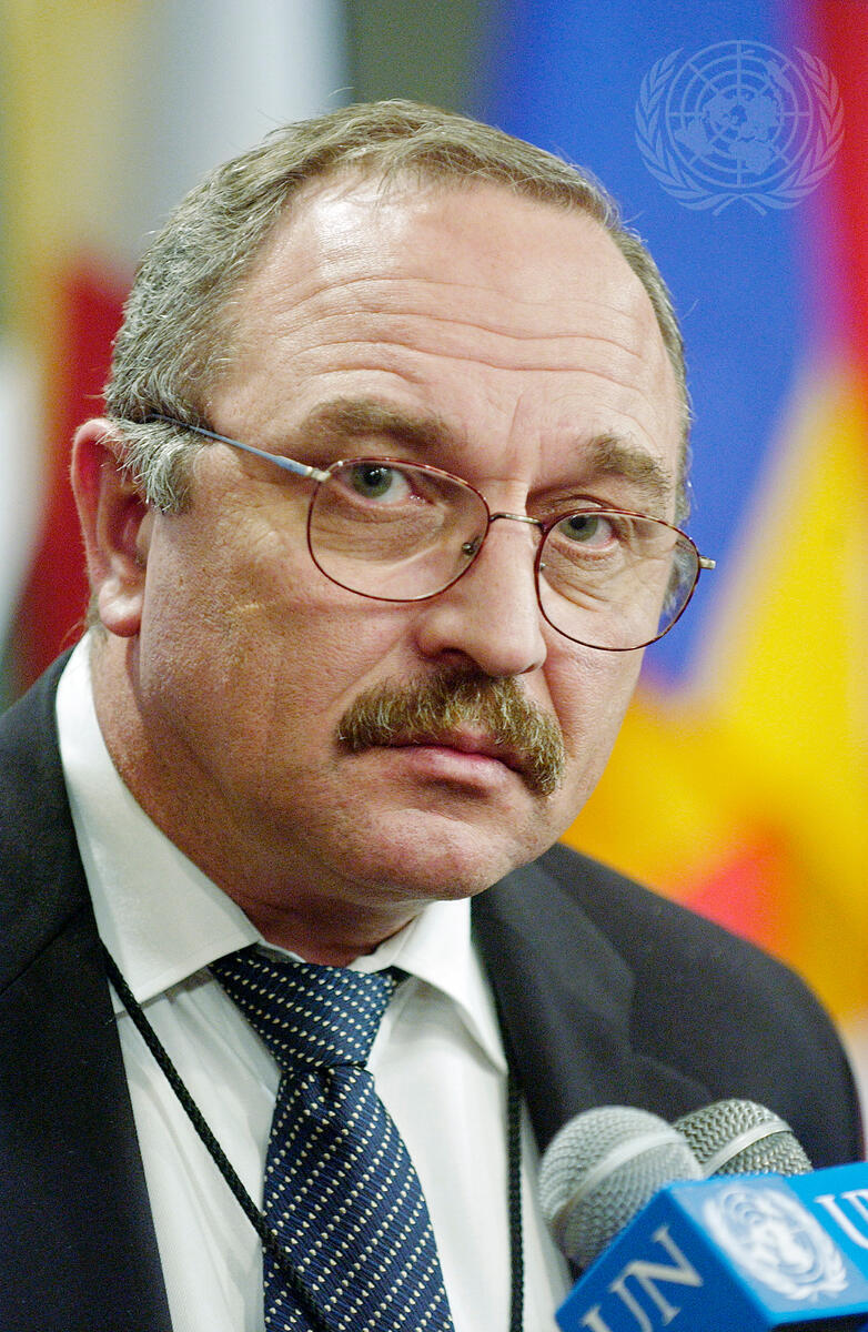 Revaz Adamia, Permanent Representative of Georgia to the United Nations, briefs correspondents after today's Security Council meeting.