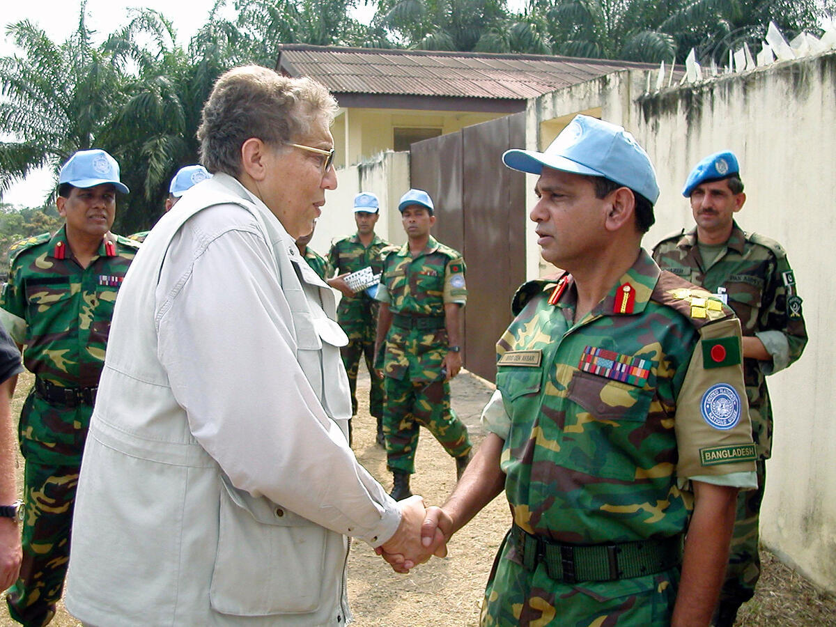 Souren Seraydarian (left), Acting SRSG of the Secretary-General for Liberia, meets with Brigade-General Fazle Akbar (right), Sector Commander, at the Bangladeshi Contingent Headquarters in Gbarnga.