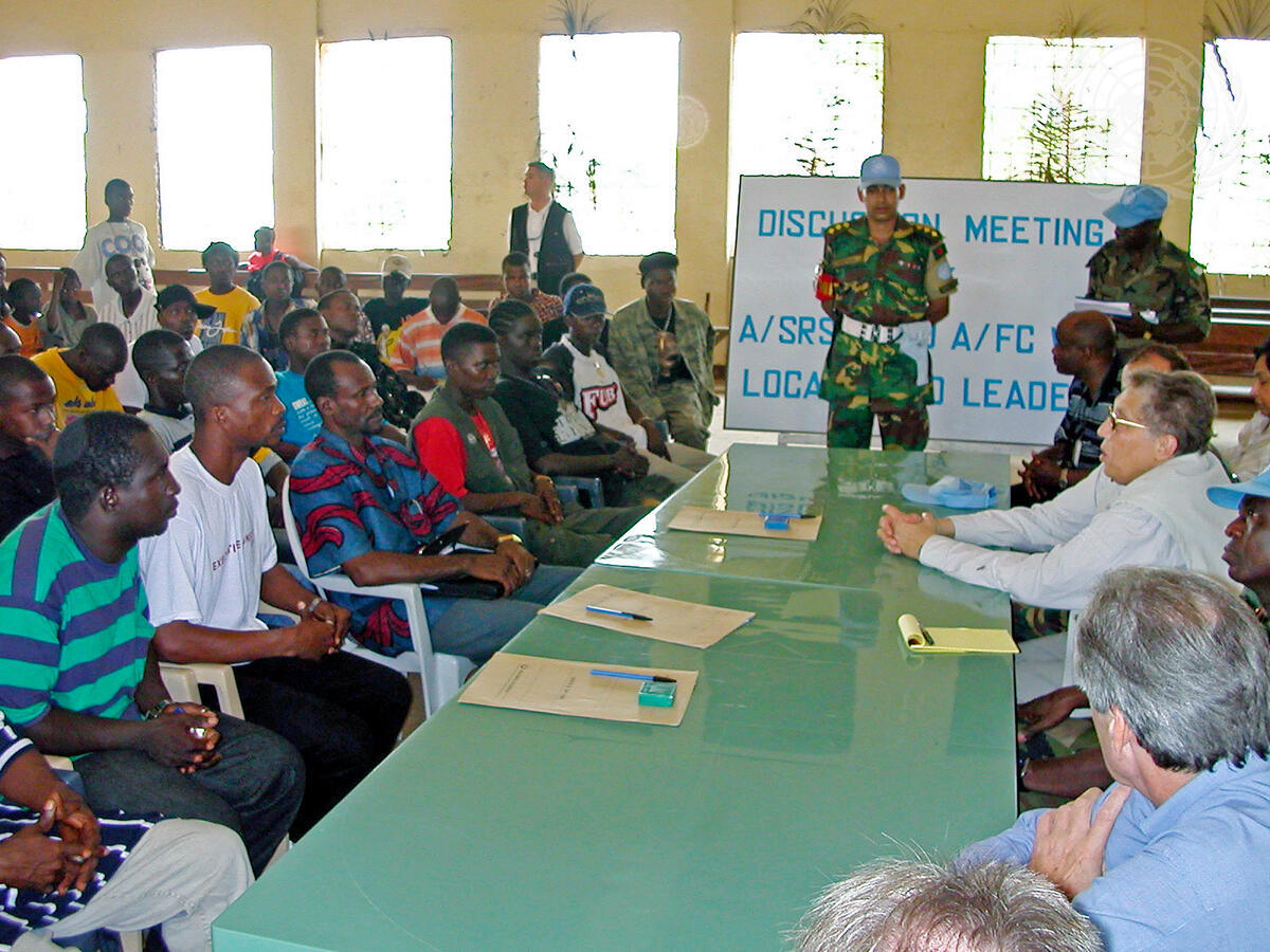 The United Nations Mission in Liberia (UNMIL) envoys, including Souren Seraydarian (right, sunglasses), Acting Special Representative of the Secretary-General for Liberia, discuss the Disarmament, Demobilization, Rehabilitation and Reintegration (DDRR) programme with Liberians United for Reconciliation and Democracy (LURD) commanders in Gbarnga.