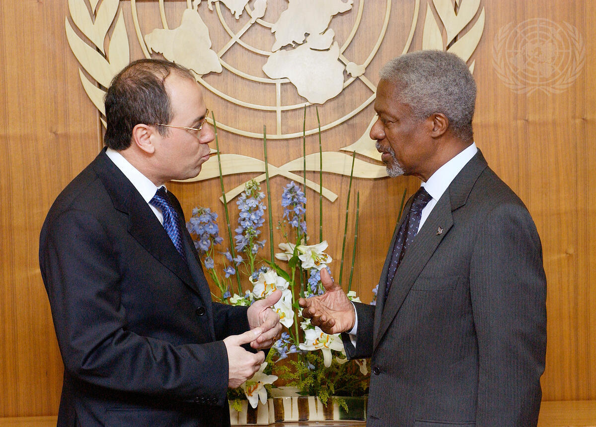 Secretary-General Kofi Annan (right) meets with Silvan Shalom, Minister for Foreign Affairs of Israel.