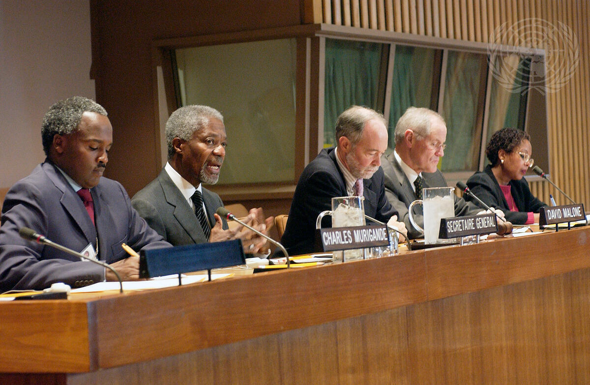 From left to right: Charles Murigande, Minister of Foreign Affairs of the Rwandese Republic, Mr. Annan, David M. Malone, President of the International Peace Academy, Bill Graham, Minister of Foreign Affairs of Canada, and Ruth Iyob, Director of the Africa Programme of the International Peace Academy.