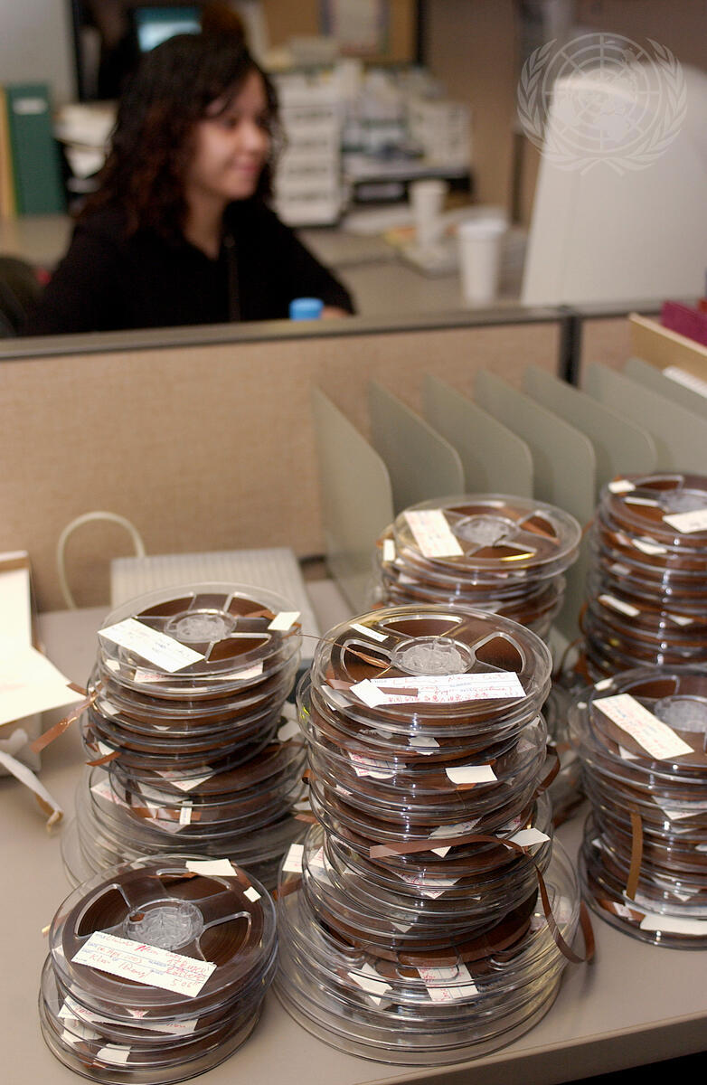 Tapes of UN Radio programmes. In the background, Limiae Aidi, Production Assistant of the UN Radio Arabic Unit, works at her desk.