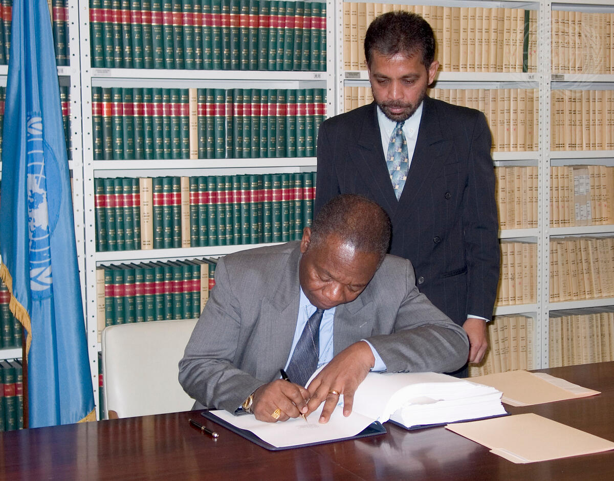 Boniface G. Chidyausiku (left), Permanent Representative of the Republic of Zimbabwe to the United Nations, signs the ""United Nations Convention Against Corruption.""
