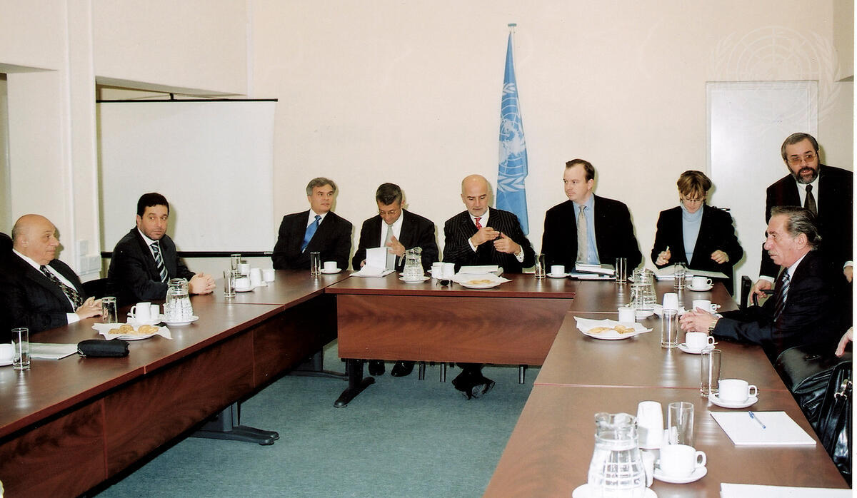 Alvaro de Soto (centre), Special Adviser of the Secretary-General on Cyprus, Tassos Papadopoulos (far right, seated), Greek Cypriot Leader, and Rauf Denktash (far left), Turkish Cypriot Leader, at the meeting.