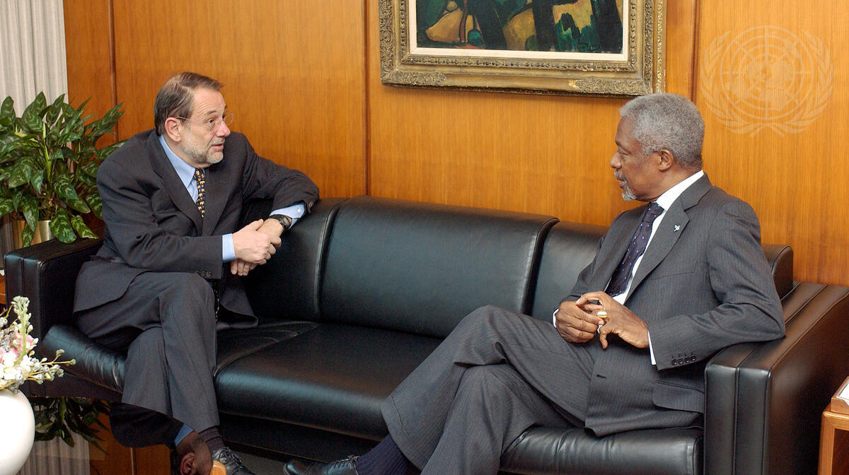 Secretary-General Kofi Annan (right) meets with Javier Solana, Secretary-General of the Council of the European Union, and High Representative for the Common Foreign and Security Policy.