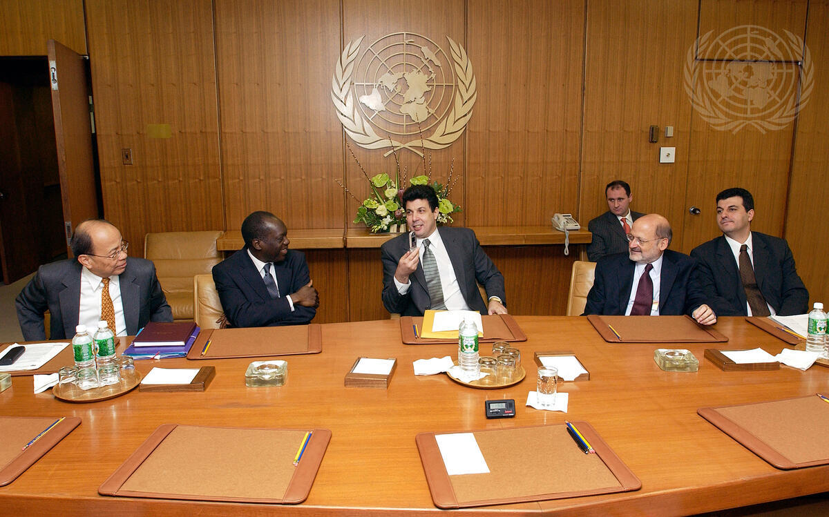 A shot of the new members of the Security Council just before the meeting with Secretary-General Kofi Annan. Left to right at the table: Lauro L. Baja, Jr., Permanent Representative of the Republic of the Philippines to the United Nations, Joël W. Adechi, Permanent Representative of the Republic of Benin to the United Nations, Abdallah Baali, Permanent Representative of Algeria to the United Nations, Ronaldo Mota Sardenberg, Permanent Representative of Brazil to the United Nations, and Mihnea Motoc, Permanent Representative of Romania to the United Nations. Secretary-General Kofi Annan today met with the new members of the Security Council.