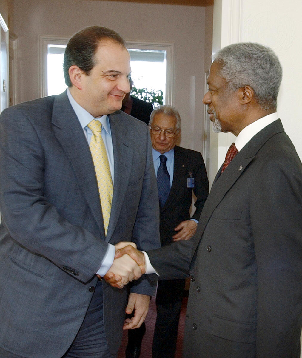 Mr. Annan (right) and Costas Karamanlis, Prime Minister of Greece, shaking hands at the Park Hotel in Bürgenstock.