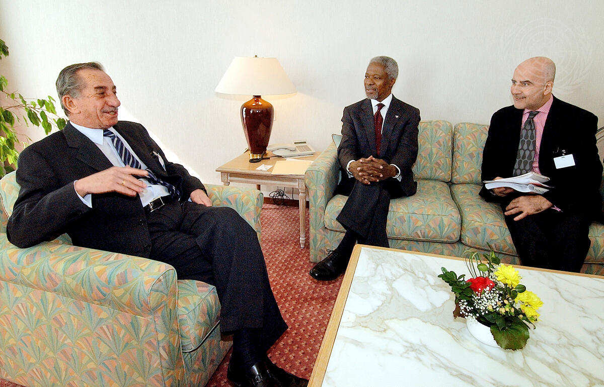 Mr. Annan (centre) with Tassos Papadopoulos (left), Greek-Cypriot President, and Alvaro de Soto (right), Special Representative of the Secretary-General on Cyprus.