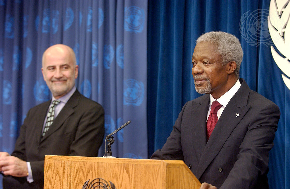 Secretary-General Kofi Annan (right) briefing correspondents at a press conference on the agreement. At left is Alvaro de Soto, former Special Representative of the Secretary-General for Cyprus.
