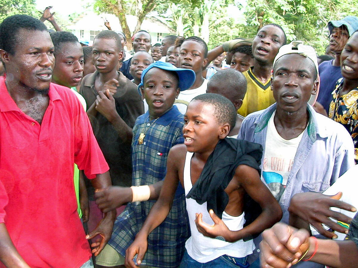 Combatants of LURD dance at the launch of DDRR information campaign in Tubmanburg.