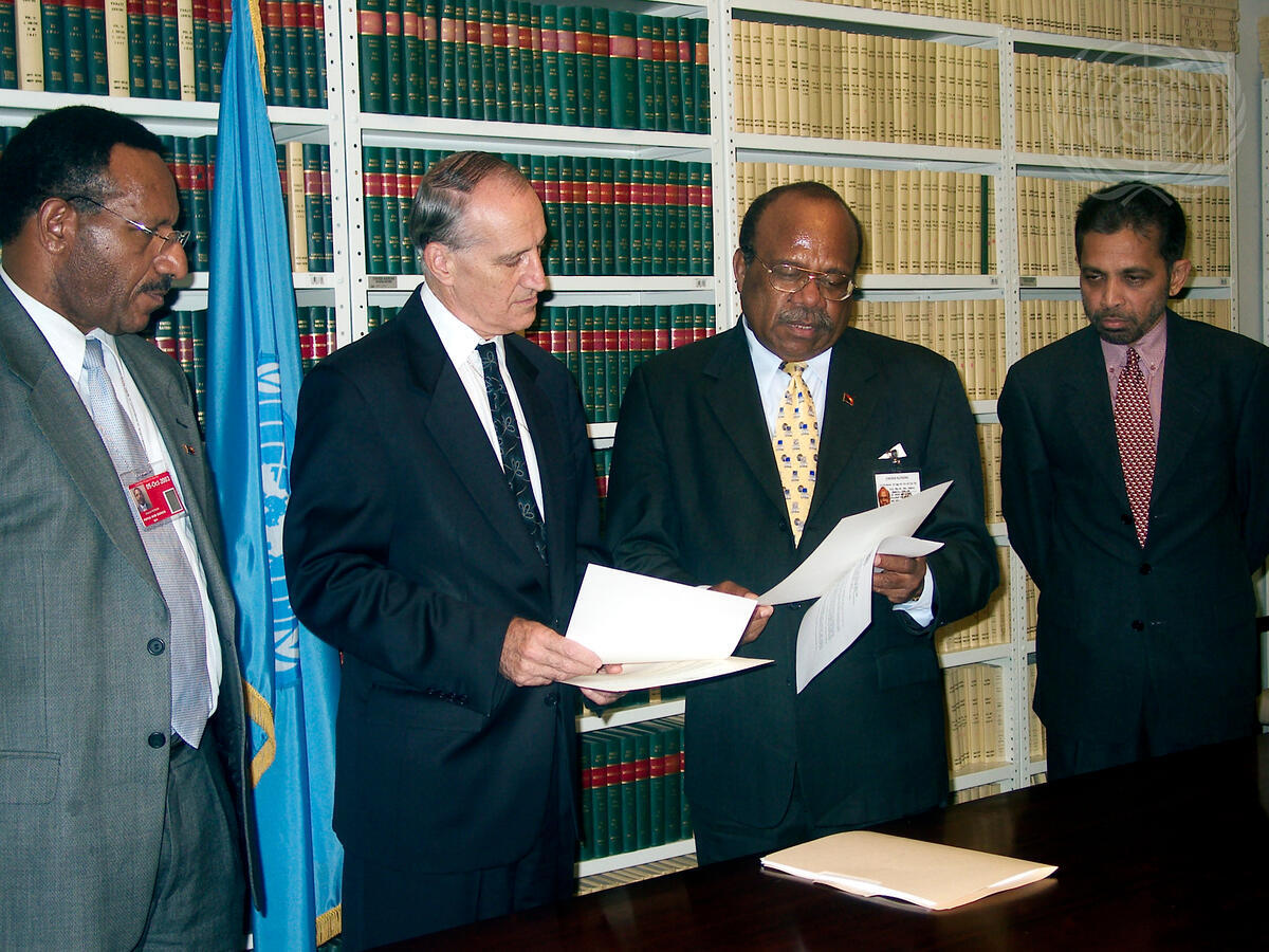 Rabbie L. Namaliu (second from right), Minister for Foreign Affairs of Papua New Guinea, signed the following Conventions today: International Convention Against the Taking of Hostages; Convention on the Prevention and Punishment of Crimes Against Internationally Protected Persons, Including Diplomatic Agents; International Convention for the Suppression of Terrorist Bombings; International Convention for the Suppression of the Financing of Terrorism. Standing far right is Palitha T.B. Kohona, Chief, Treaty Section.