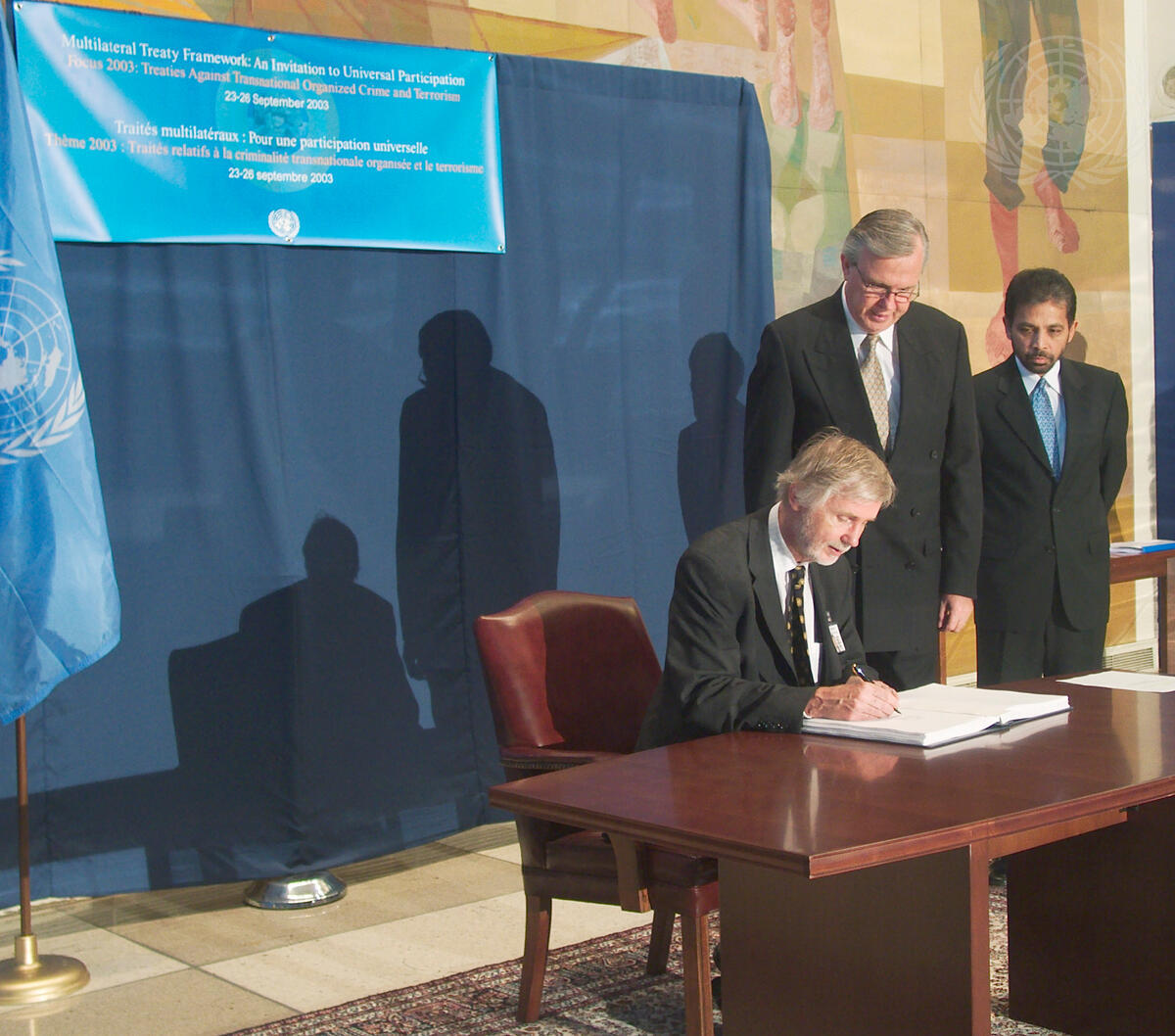 Erkki Tuomioja (seated), Minister for Foreign Affairs of Finland, signs the Optional Protocol to the Convention against Torture and Other Cruel, Inhuman or Degrading Treatment or Punishment, 2002. Standing second nom right is Hans Corell, Under-Secretary-General for Legal Affairs and Legal Counsel,