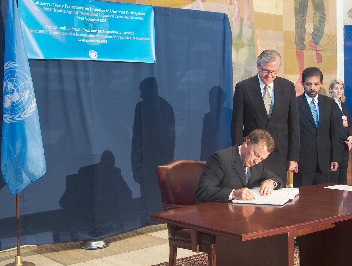 Phil Goff (seated), Minister for Foreign Affairs and Trade of New Zealand, signs the Optional Protocol to the Convention against Torture and Other Cruel, Inhuman or Degrading Treatment or Punishment, 2002, and ratifies the Rotterdam Convention on the Prior Informed Consent Procedure for Certain Hazardous Chemicals and Pesticides in International Trade, 1998. Standing second from right is Hans Corell, Under-Secretary- General for Legal Affairs and Legal Counsel, and standing far right is Palitha T.B. Kohona, Chief, Treaty Section.