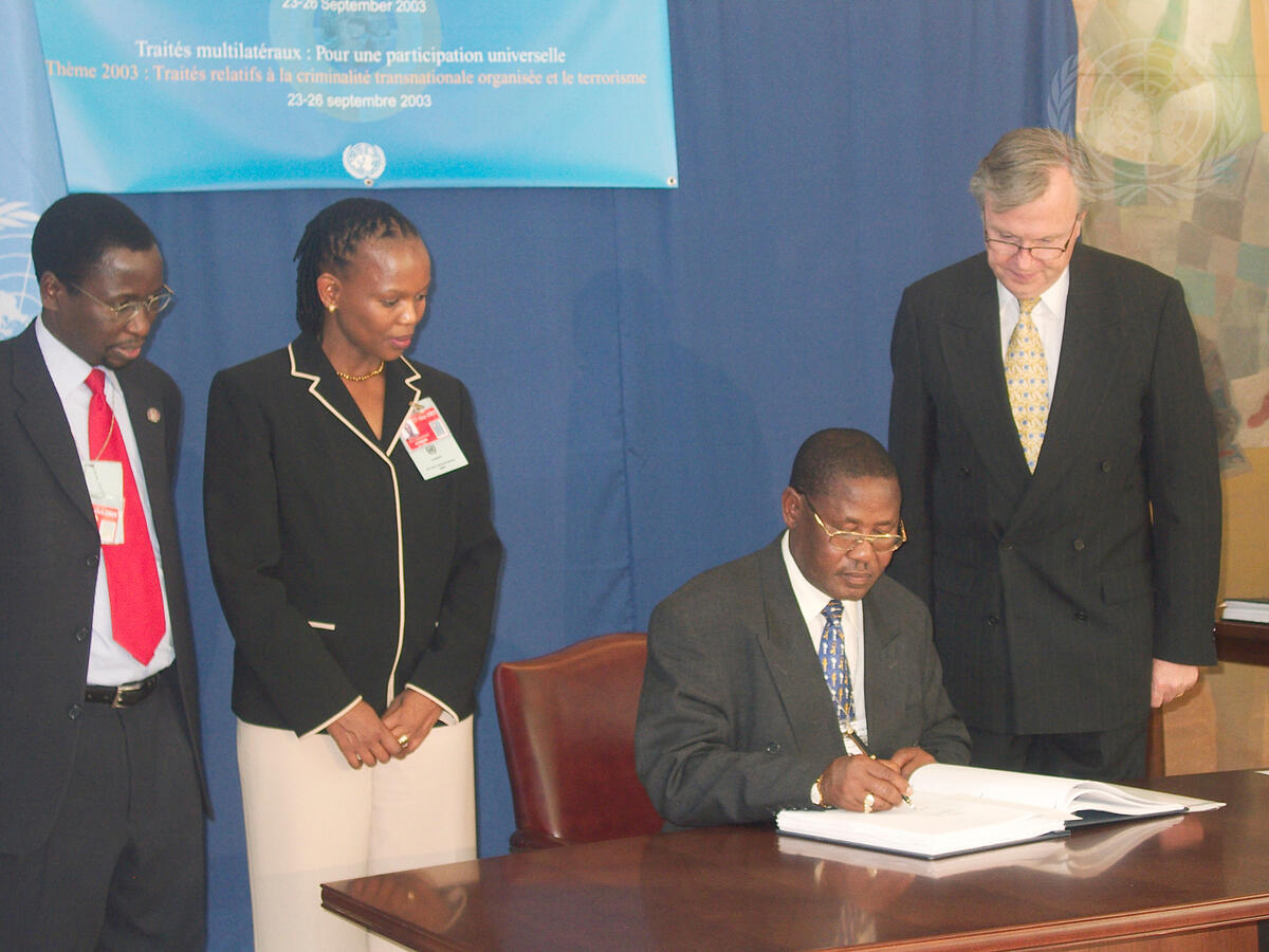 Mompati S. Merafhe (seated), Minister for Foreign Affairs and International Cooperation of Botswana, signs the Optional Protocol to the convention on the Rights of the Child on the Involvement of Children in Armed Conflict, 2000; and Optional Protocol to the convention on the Rights of the Child on the sale of children, child prostitution and child pornography, 2000. Standing at right is Hans Corell, Under Secretary-General for Legal Affairs and Legal Counsel.