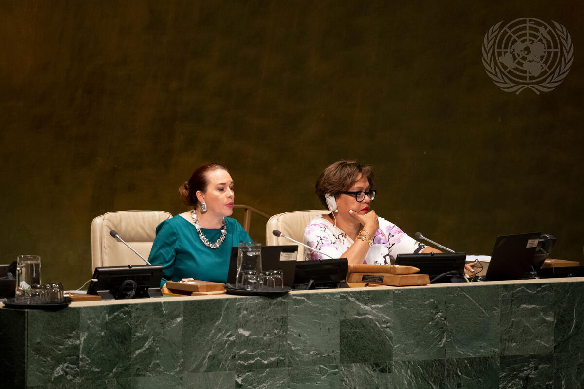 María Fernanda Espinosa Garcés (left), President of the seventy-third session of the General Assembly, chairs the General Assembly meeting on the integrated and coordinated implementation of and follow-up to the outcomes of the major United Nations conferences and summits in the economic, social and related fields, and the draft resolution on the format and organizational aspects of the international migration review forums. At right is Ruth de Miranda, Director of the General Assembly and Economic and Social Council (ECOSOC) Affairs Division of the Department of General Assembly and Conference Management (DGACM).