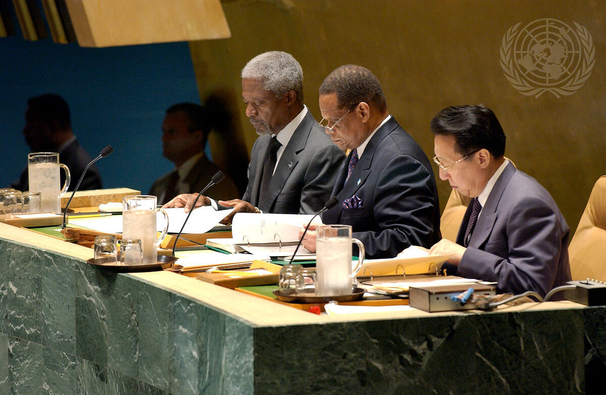 The fifty-eighth session of the General Assembly opened today. Seated at the podium from left to right are: Secretary-General Kofi Annan; Julian R. Hunte (St. Lucia), President of the fifty-eighth session of the General Assembly; and Chen Jian, Under-Secretary-General, Department of General Assembly Affairs and Conference Services.