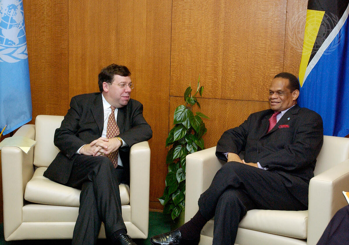 Julian Robert Hunte (right), Permanent Representative of Saint Lucia and President of the fifty-eighth session of the General Assembly, meets with Brian Cowen, Minister for Foreign Affairs of Ireland.