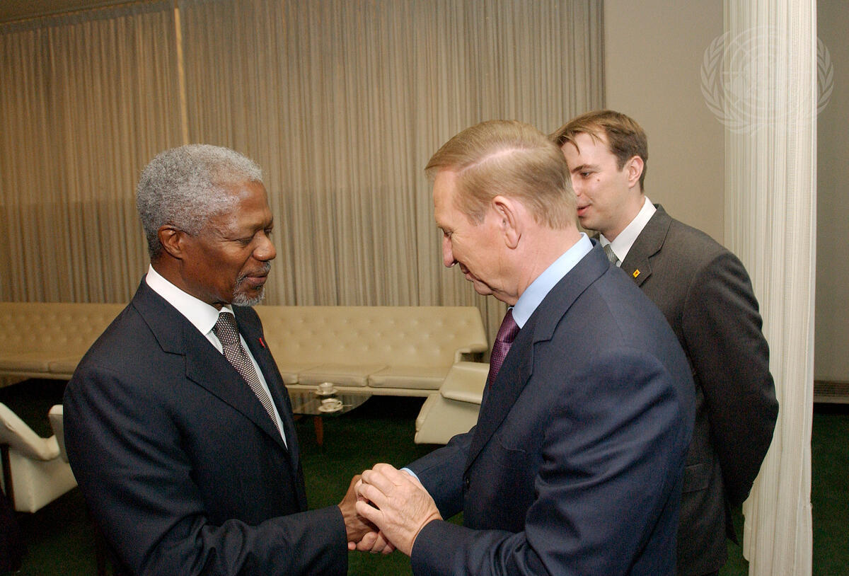 Secretary-General Kofi Annan (left) greets Leonid Kuchma, President of Ukraine, who will speak at the high-level plenary meeting devoted to the follow-up to the outcome of the twenty-sixth special session and the implementation of the declaration of Commitment on HIV/AIDS.