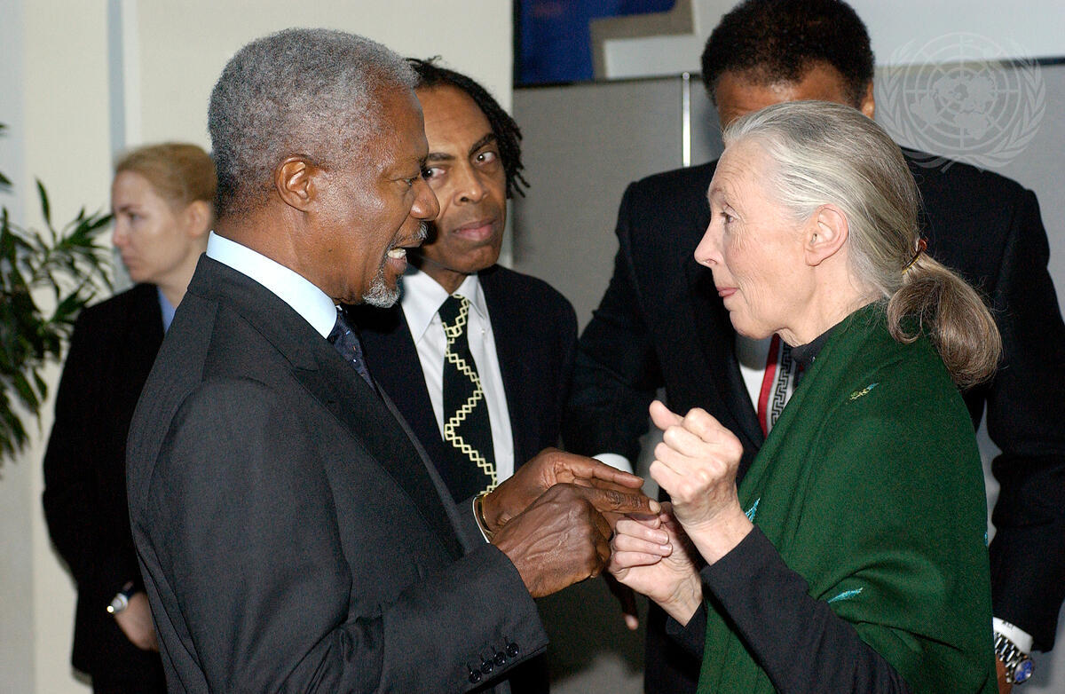 Secretary-General Kofi Annan (left) greets Messsenger of Peace, Jane Goodall, Gilberto Gil, Brazilian Minister of Culture, and composer, singer and guitarist, is at centre.