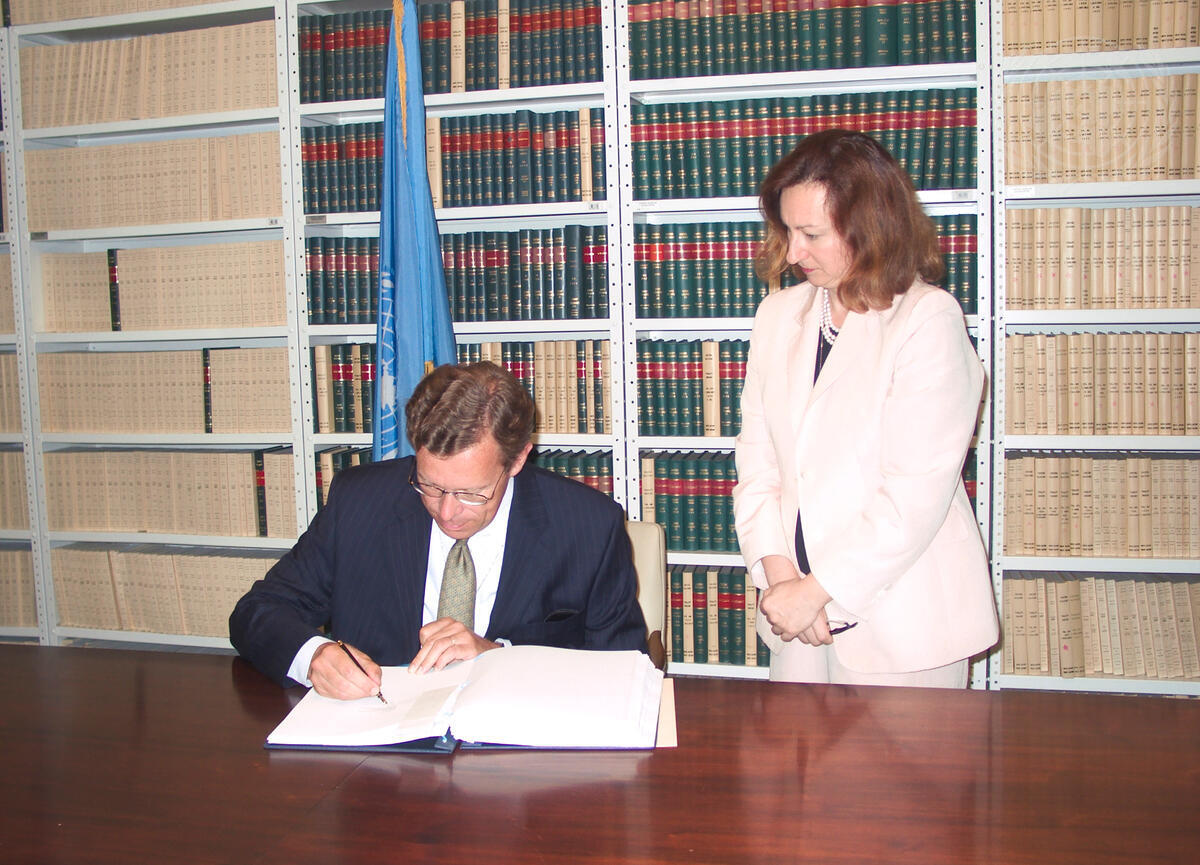 Dirk Jan van den Berg (left), Permanent Representative of the Kingdom of the Netherlands to the United Nation, signs the "Agreement on Privileges and Immunities of the International Criminal Court".