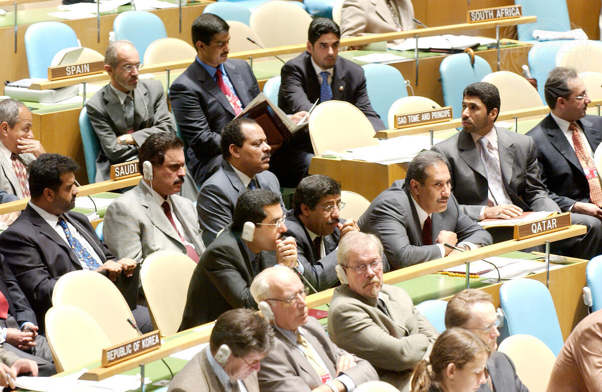 The delegation of the State of Qatar, headed by Hamad bin Jassem bin Jabr Al-Thani (behind nameplate), First Deputy Prime Minister and Minister for Foreign Affairs of the State of Qatar, at the fifty-eighth session of the General Assembly.