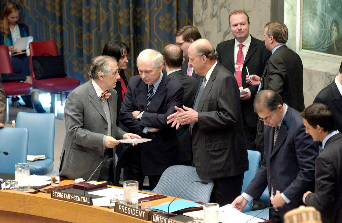 Left to right at the table: Inocencio F. Arias, Permanent Representative of Spain to the United Nations, Emyr Jones Parry, Permanent Representative of the United Kingdom to the United Nations, and John D. Negroponte, Permanent Representative of the United States to the United Nations, and President of the Security Council for the month of October.
