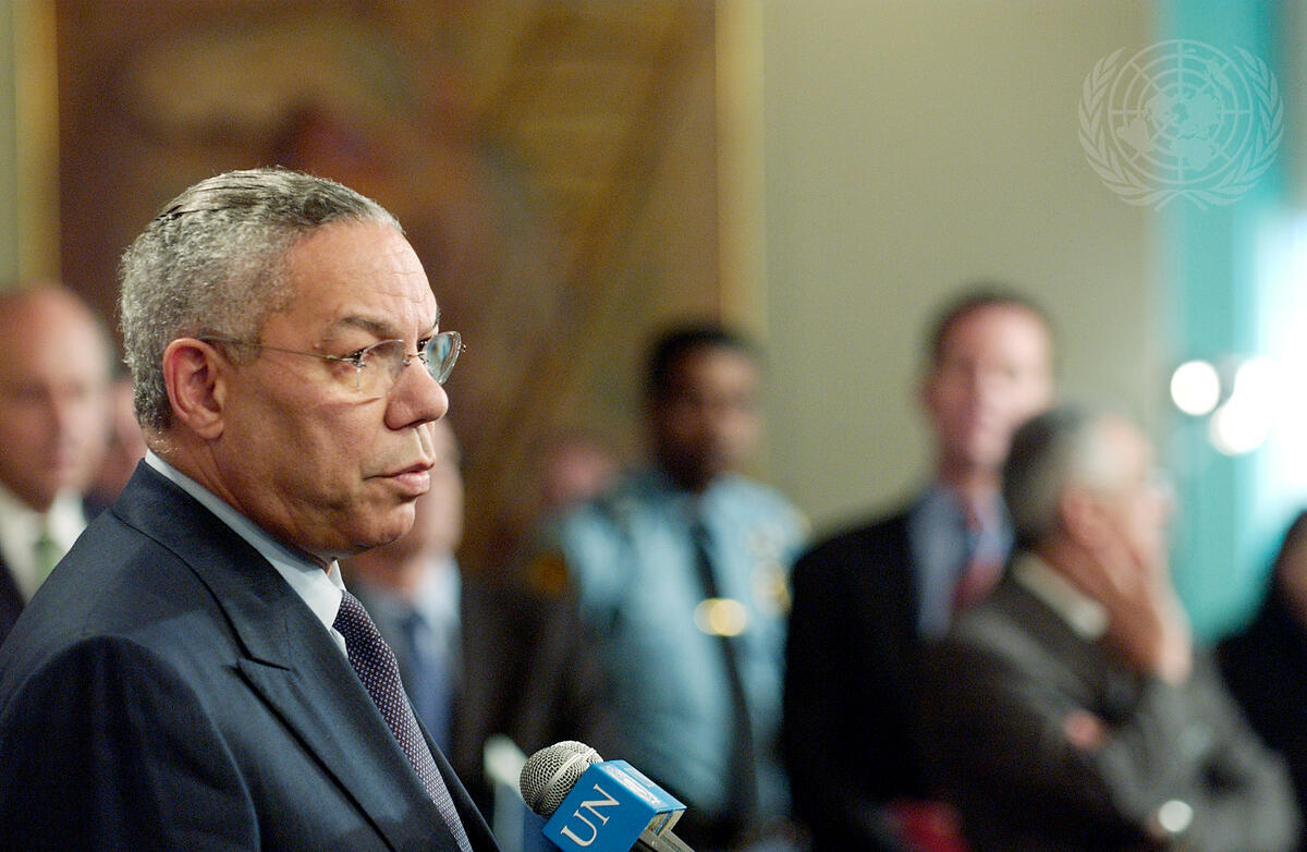 Colin L. Powell, Secretary of State of the United States of America, briefs correspondents at UN Headquarters on a new Security Council resolution on Iraq.