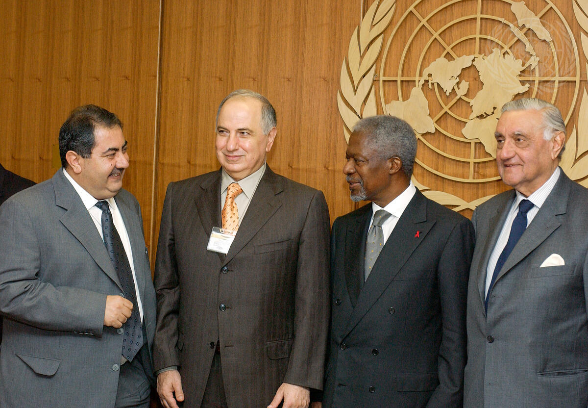 Secretary-General Kofi Annan (second from right) meets with the delegation of the Governing Council of Iraq at UN Headquarters. From left to right: Hoshyar Zebari, Foreign Minister of the Governing Council of Iraq, Ahmad Chalabi, President of the Governing Council of Iraq, Secretary-General Kofi Annan and Adnan Pachachi, Member of the Governing Council of Ira