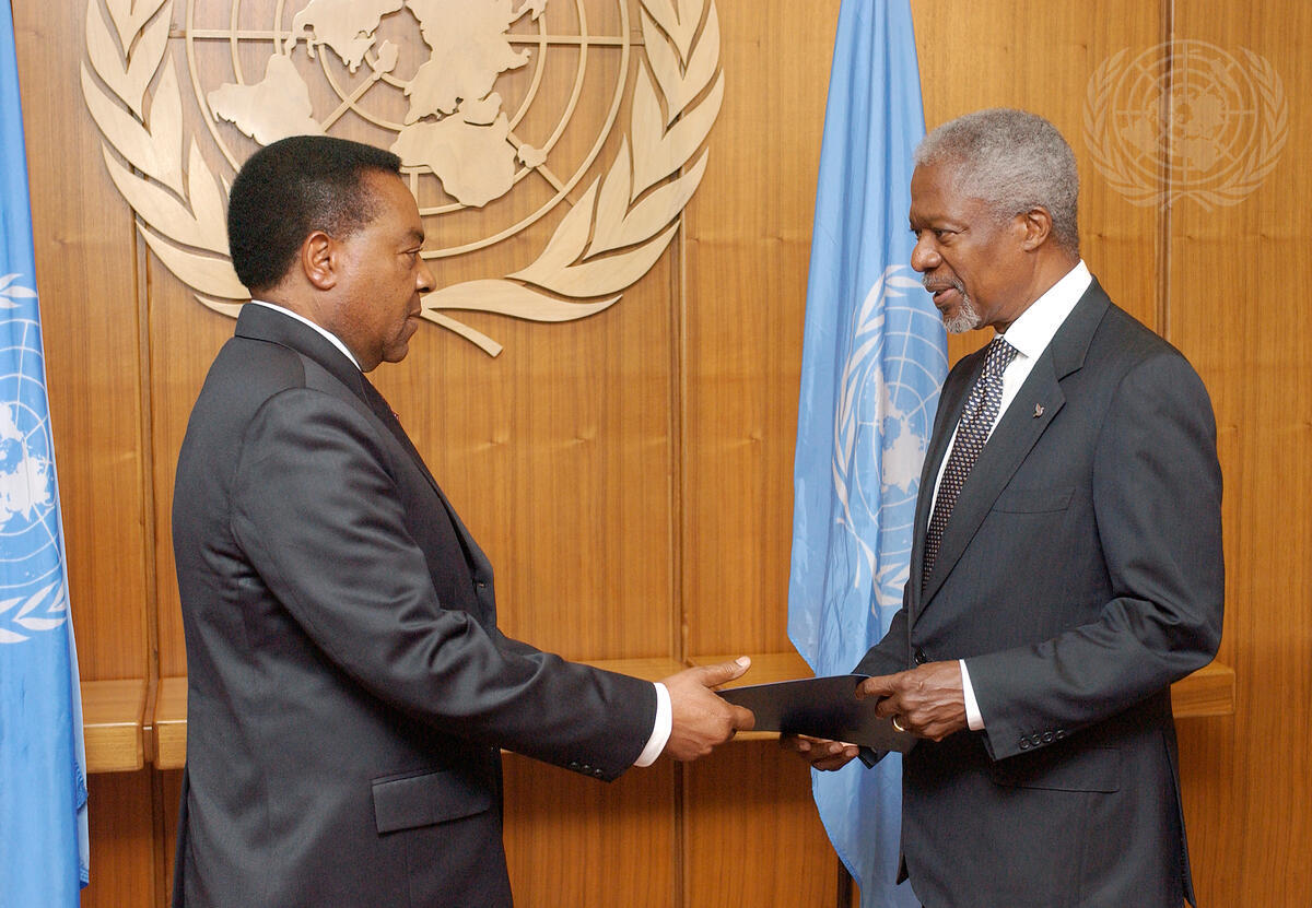 Augustine P. Mahiga (left), new Permanent Representative of the United Republic of Tanzania to the United Nations, presents his credentials to Secretary-General Kofi Annan.