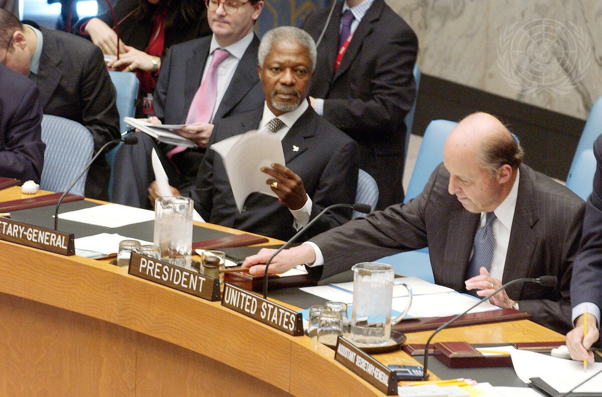 John D. Negroponte (right), Permanent Representative of the United States to the United Nations, and President of the Security Council for the month of October, calls the meeting to order. At left is Secretary-General Kofi Annan.