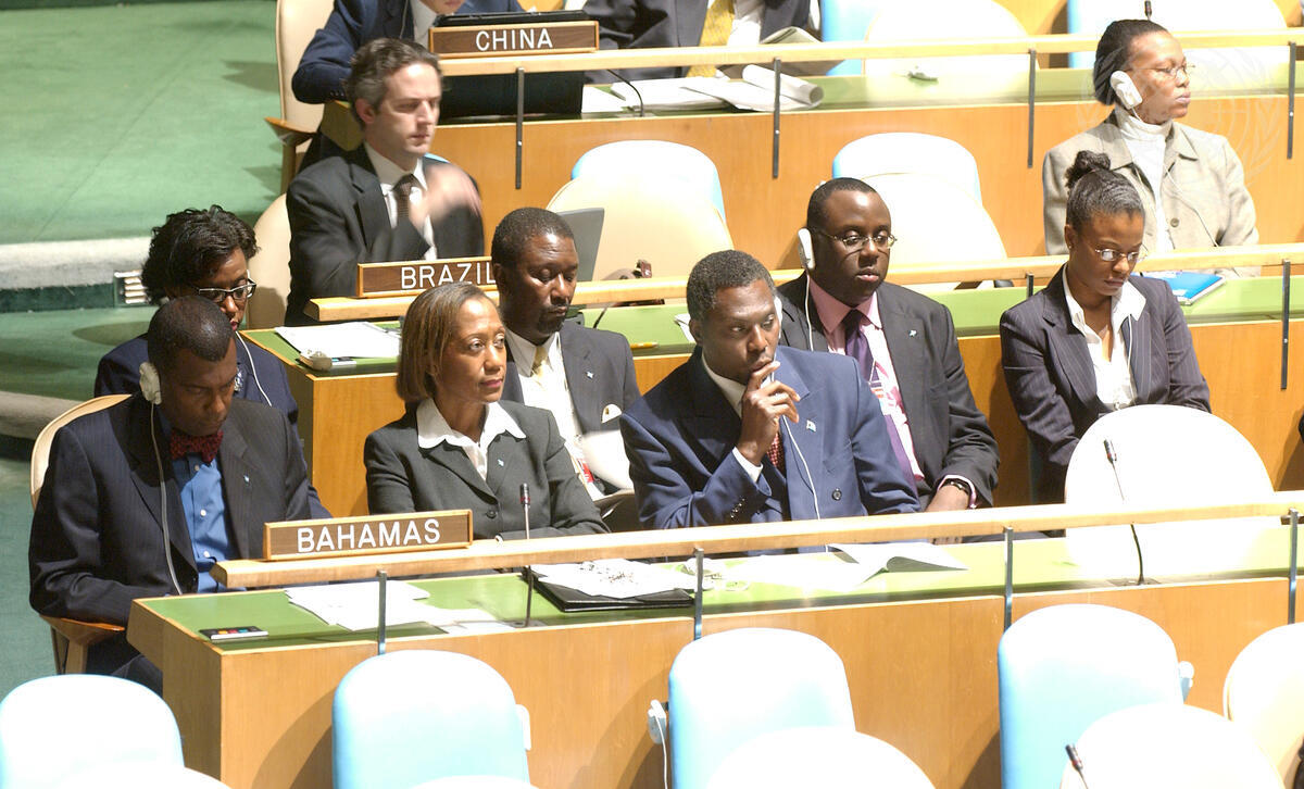 The delegation of the Commonwealth of the Bahamas, headed by Vinci Frederick A. Mitchell (behind nameplate), Minister for Foreign Affairs and the Public Service of the Commonwealth of the Bahamas, at the fifty-eighth session of the General Assembly.