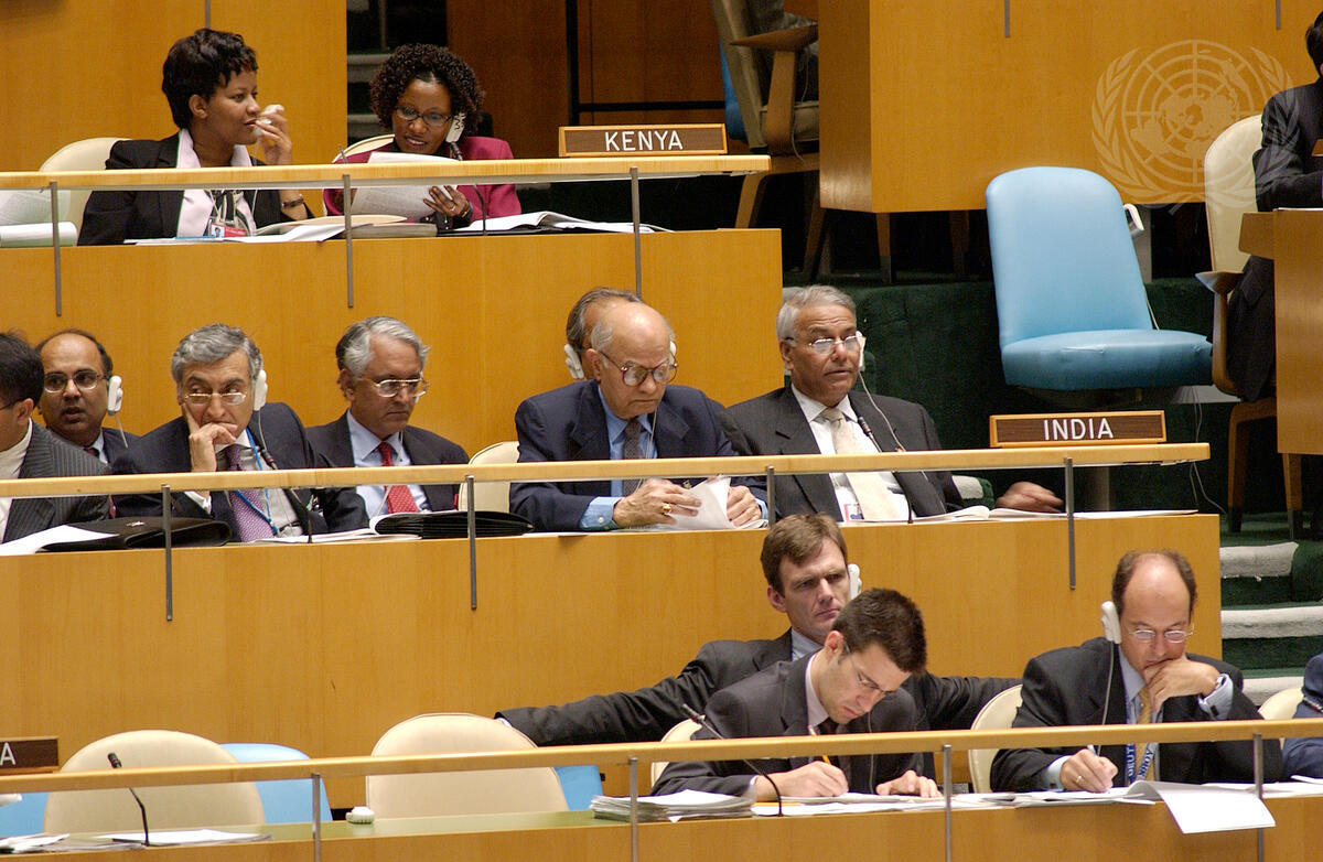 The delegation of India, headed by Yashwant Sinha (behind nameplate), Minister for Foreign Affairs of India, at the fifty-eighth session of the General Assembly.
