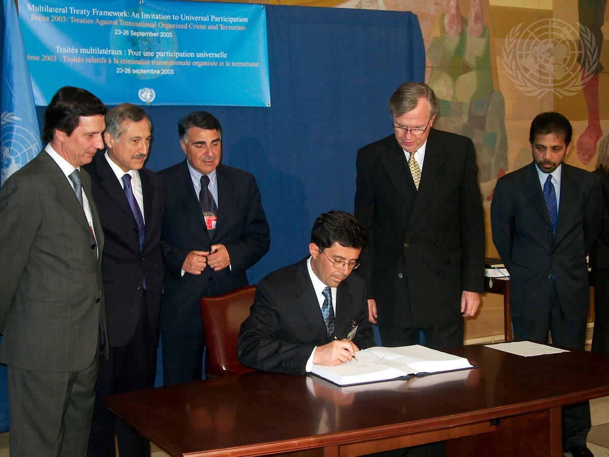 Azali Assoumani (left), President of the Union of the Comoros, accessions the Convention on the Prevention and Punishment of Crimes against Internationally Protected Persons, including Diplomatic Agents, 1973; the International Convention against the Taking of Hostages, 1979; the United Nations Convention against Transnational Organized Crime, 2000, and ratifies the International Convention for the Suppression of Terrorist Bombings, 1997, and the International convention for the Suppression of the Financing of Terrorism, 1999. Second ftom right is Hans Corell (shaking hands with Mr. Assoumani), Under-Secretary-General for Legal Affairs and Legal Counsel, and far right is Palitha T.B. Kohona, Chief, Treaty Section.