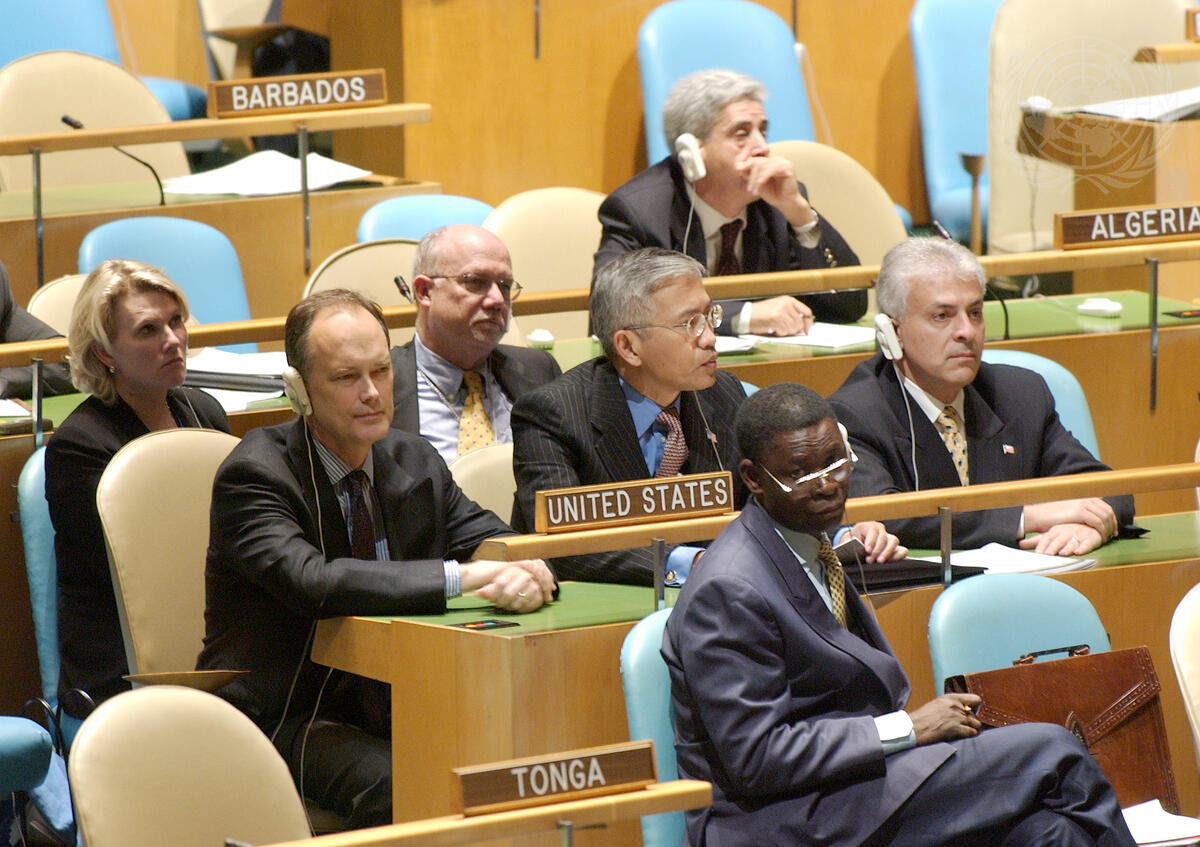 The delegation of the United States of America, headed by James B. Cunningham (behind nameplate), Deputy Permanent Representative of the United States to the United Nations, at the fifty-eighth session of the General Assembly.