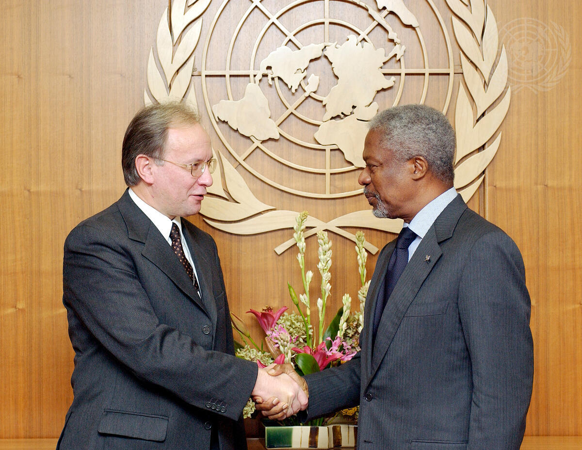 Secretary-General Kofi Annan (right) meets with Sergei N. Martynov, Minister for Foreign Affairs of the Republic of Belarus.
