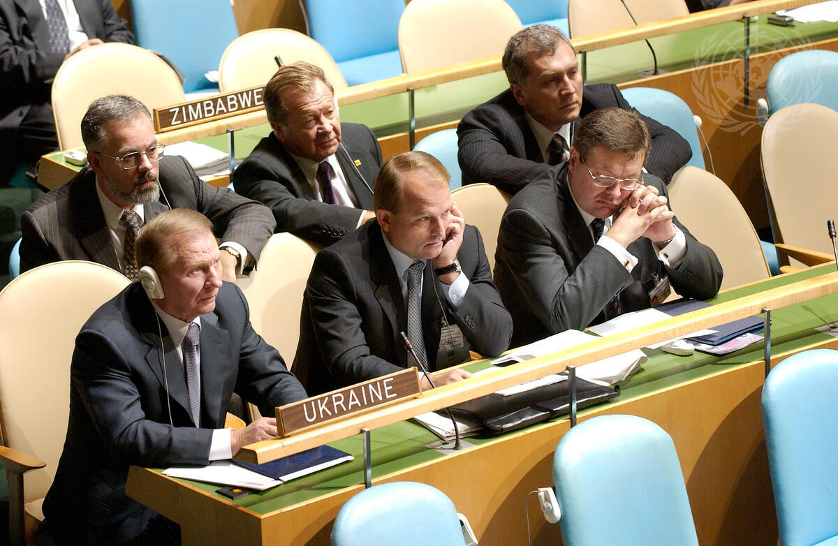 The delegation of Ukraine, headed by Leonid D. Kuchma (behind nameplate), President of Ukraine, at the fifty-eighth session of the General Assembly.