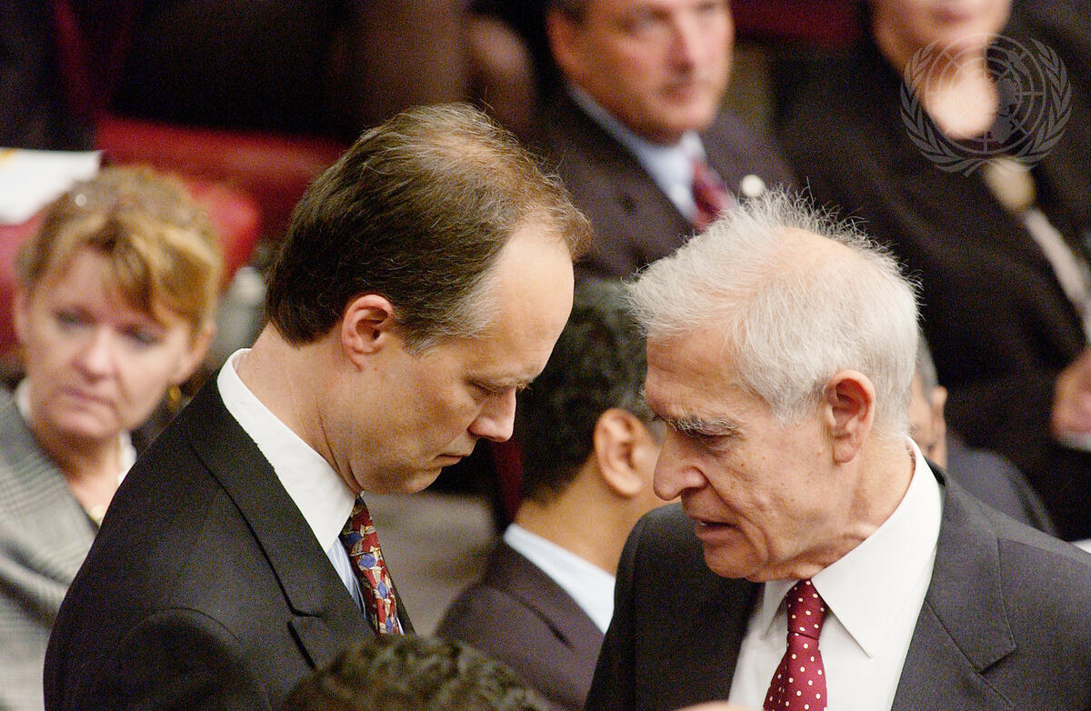 James B. Cunningham (left), Deputy Permanent Representative of the United States to the United Nations, and Yahya Mahmassani, Permanent Observer for the League of Arab States to the United Nations, at today's Security Council meeting.