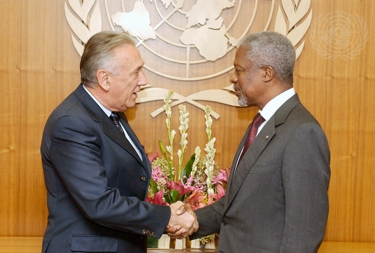 Secretary-General Kofi Annan (right) meets with László Kovács, Minister for Foreign Affairs of the Republic of Hungary.