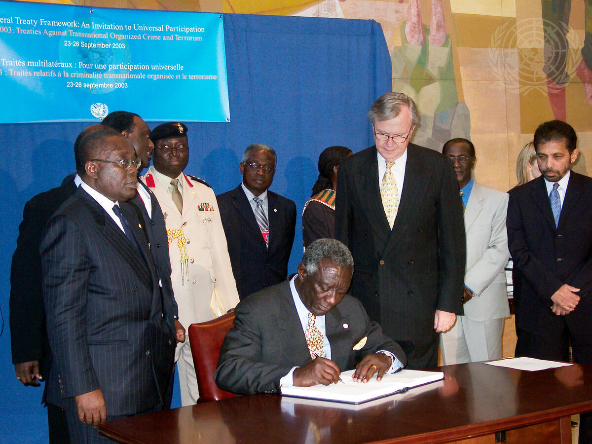 John Agyekum Kufour (seated), President of Ghana, signs the Convention for the Suppression of the Traffic in Persons and of the Exploitation of the Prostitution of Others, 1950; Final Protocol for the Suppression of the Traffic in Persons and of the Exploitation of the Prostitution of Others, 1950; Optional Protocol to the Convention on the Rights of the Child on the Involvement of Children in Armed Conflict, 2000, and Optional Protocol to the Convention on the Rights of the Child on the sale of children, child prostitution and child pornography, 2000. Second from right is Hans Corell, Under-Secretary-General for Legal Affairs and Legal Counsel, and far right is Palitha T.B. Kohona, Chief, Treaty Section.