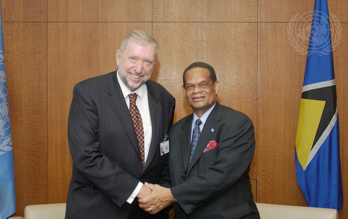 Julian Robert Hunte (Saint Lucia) (right), President of the fifty-eighth session of the General Assembly, meets with Dimitrij Rupel, Minister for Foreign Minister of the Republic of Slovenia.