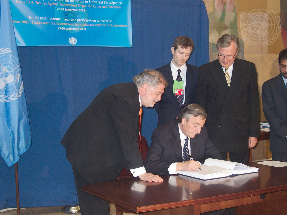 Nestor Carlos Kirchner (seated), President of Argentina, ratifies with declaration the Optional Protocol to the Convention on the Rights of the Child on the sale of children, child prostitution and child pornography, 2000; ratifies the International Convention for the Suppression of Terrorist Bombings, 1997, and signs the Framework Convention on Tobacco Control, 2003. Standing at right is Hans Corell, Under-SecretaryGeneral for Legal Affairs and Legal Counsel.
