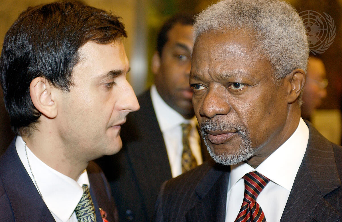 Secretary-General Kofi Annan (right) speaks with Stefan Tafrov, Permanent Representative of the Republic of Bulgaria to the United Nations.