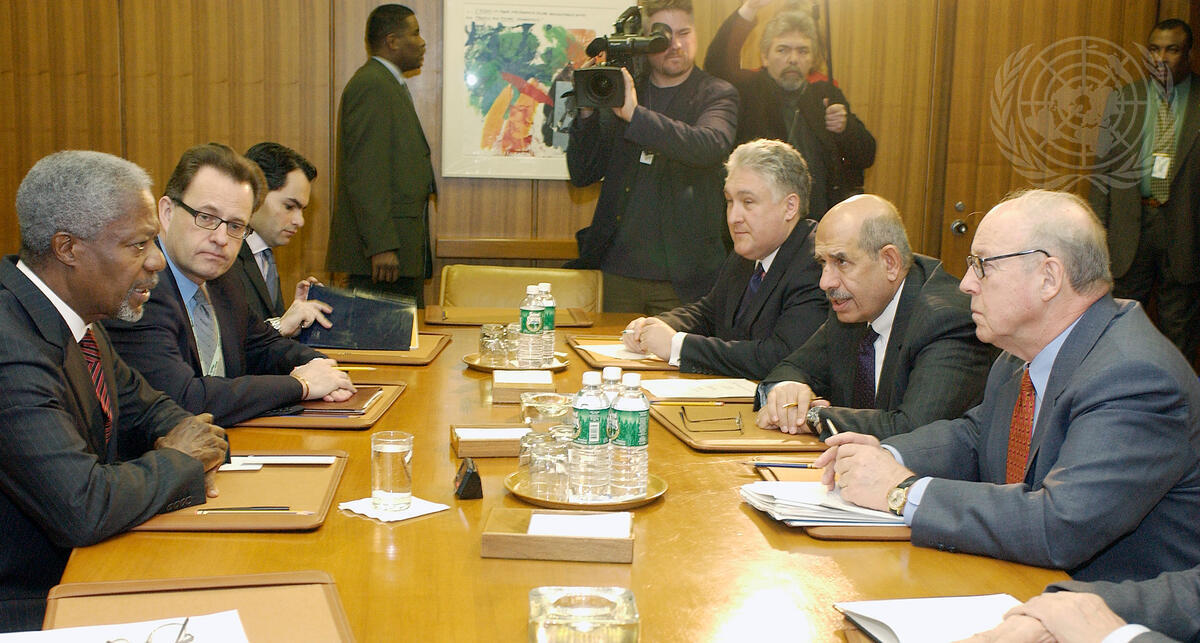 Secretary-General Kofi Annan (left) meets with Hans Blix (right), Executive Chairman of the UN Monitoring, Verification and Inspection Commission (UNMOVIC) and Mohamed ElBaradei (second from bottom right), Director General of the International Atomic Energy Agency (IAEA).